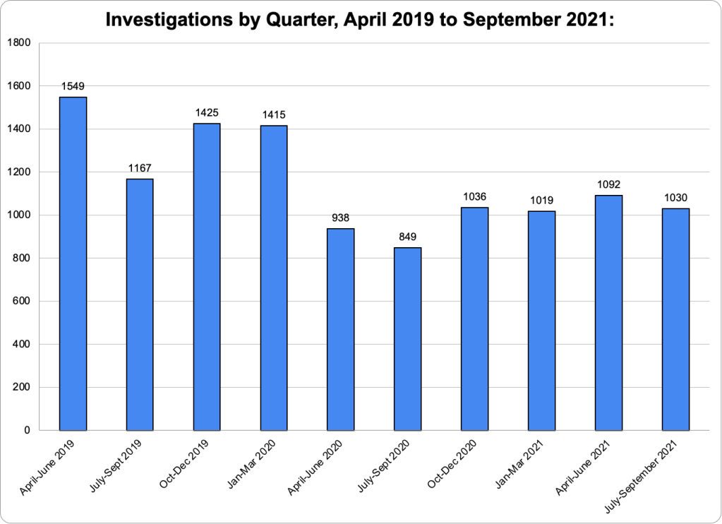 Figure Five shows the large drop in the number of investigations in the first four pandemic quarters compared to four preceding quarters. In the fourth quarter of FY 2021, the number of investigations was closer to pre-pandemic levels but still lower - 1030 in FY 21 versus 1176 in FY 2019. Notably, the number of investigations hardly dropped in quarter 4 over quarter 3 even though the number of referrals (shown above) dropped greatly. This lack of a summer drop in investigations reflects the increased percentage of referrals accepted, as discussed above. It’s as if the agency was trying to keep the number of investigations constant by rejecting more referrals when they received more of them, but this may just reflect the lower credence given to referrals from schools.