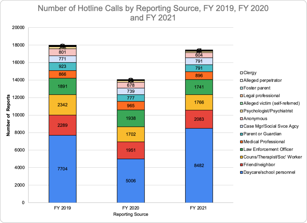 Figure Two shows the number of referrals made by each reporting source in Fiscal Years 2019, 2020 and 2021. This number, which had dropped from 17,960 in FY 2019 to 14,046 in 2020 with the onset of the pandemic, bounced back to 17,422 in FY 2021, almost the same number as in FY 2019. School and daycare personnel are traditionally the largest referral source, and they actually made substantially more reports in FY2021 than they did in the pre-pandemic fiscal year, 2019 - 8,482 compared to 7,704. They also made a higher percentage of all reports-48.7% compared to 42.9 percent in FY 2019. This increase in teacher reporting relative to FY 2019 may reflect teachers’ increased concerns about children missing too many days of online schooling last spring, as well as concerns raised by seeing children in the fall for the first time in 18 months.