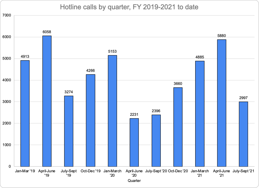 As shown in Table One, referrals did rise in September 2021 to 1,148 from only 759 in August. That is considerably more than the 942 referrals in September 2020, but considerably less than the 1,377 calls in September 2019. The absolute difference in referrals between August and September of FY 2021 was smaller than in FY 2019 but the percentage difference was slightly greater. (FY 2020 showed less of an increase between August and September referrals in both number and percentage, showing the effects of the pandemic and virtual schooling.) But there was no dramatic onslaught of referrals in the wake of schools opening in person in September 2021, compared to a normal September. However, based on FY 2019 data, October brings more referrals than September, so we will see what the next quarter’s data show.