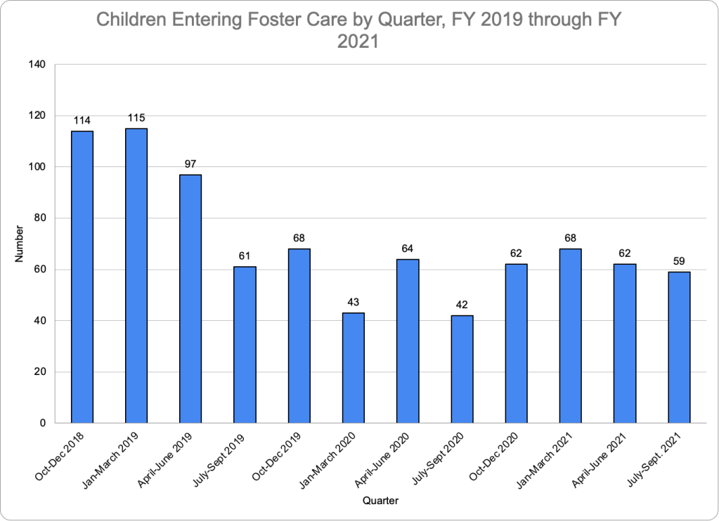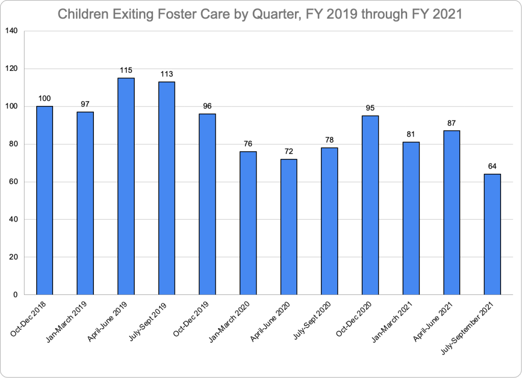The number of children entering foster care decreased in the last quarter of FY 2021, after rebounding from a large pandemic-induced drop in the fall and winter quarters and then decreasing in the spring quarter. Fifty-nine children entered foster care in the last quarter of FY 2021, as shown in Figure Ten. Figure Eleven shows that exits from foster care decreased in Quarter 4 but were still more numerous than entries. There were 64 exits from foster care compared to 59 children entering care.