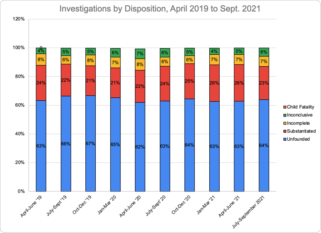 *While the number of referrals accepted for investigation was 3,902 in FY2023 according to the Dashboard’s Hotline Calls by Referral Type graphic, the total number of investigations displayed in the Investigations by Disposition graphic was 3,704. The reason for the difference is unclear. According to the Dashboard, “accepted for investigation” means that “the hotline call resulted in a new investigation being opened on the family.” So the two numbers should be the same.