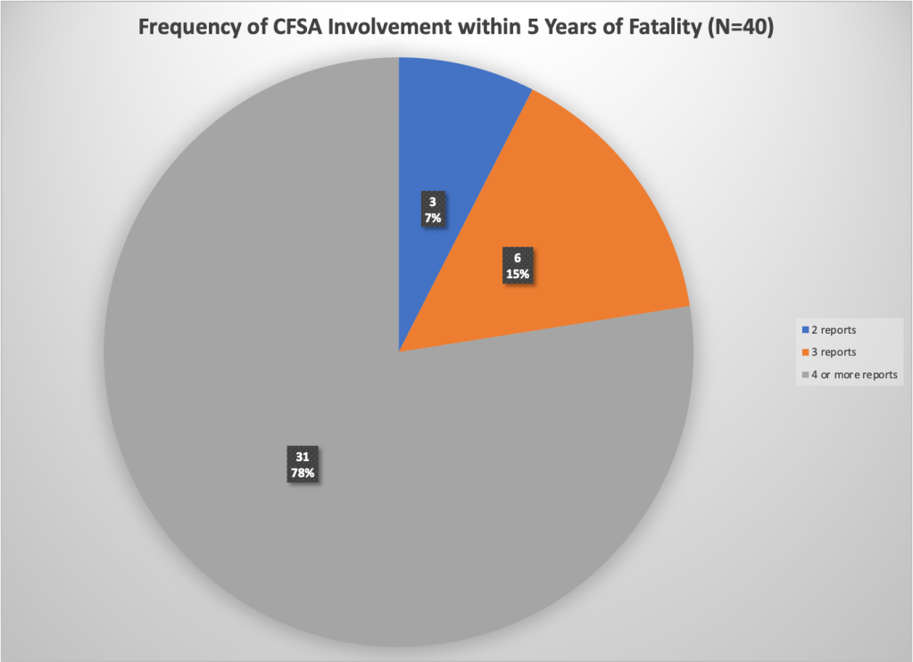 The chart below shows the frequency of CFSA involvement for the families with fatalities. All of the families had more than one report to CPS within five years of the fatality, 31 families, or 77 percent of the families, had four or more reports. So these families were very troubled, and there were many opportunities for CFSA to intervene.