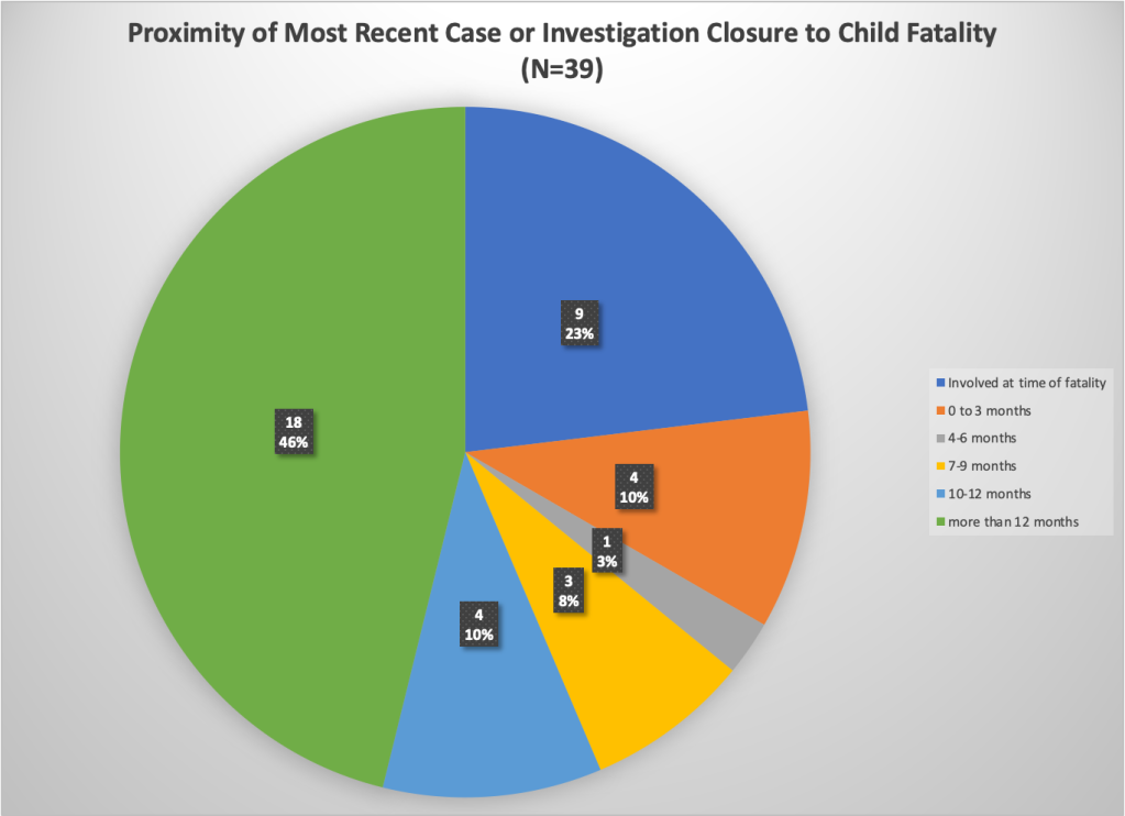 Nine of the 40 families reviewed in the report (or about 23 percent) were involved with CFSA at the time of the fatality. Of these nine families, five had an open foster care case, two had an open investigation, one had an open in-home case and an open investigation, and one had an open permanency case and an open CPS investigation. Obviously it is concerning that these fatalities could occur while CFSA was actively involved with the family. One has to wonder whether any red flags were disregarded. But without knowing the details of CFSA’s involvement with these families, it is impossible for readers of this report to make any conclusions about agency practice.