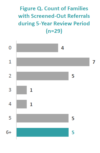 In addition to the nine families who had an open investigation or case at the time of the fatality, four families (10 percent) had a case or investigation closed within three months of the fatality, four families had a case or investigation closed within four to nine months of the fatality, and another four families had a closure within 10 to 12 months of the fatality. It is concerning that so many families had such recent contact with CFSA; one wonders whether the case closures were premature and whether any red flags were missed. One family was not included in these calculations because it had four referrals that were screened out and no investigations or cases. It is concerning that a family with a later fatality had four reports screened out and it would be interesting to know when those referrals came in and whether the CFR unit looked at why they were rejected. There has been some concern about the accuracy of hotline decision-making. In a 2016 study, conducted by the Center for the Study of Social Policy, the court monitor in the LaShawn class action suit, reviewers agreed with the decision to screen out the referral in only 73 percent of the 223 screened-out referrals studied.